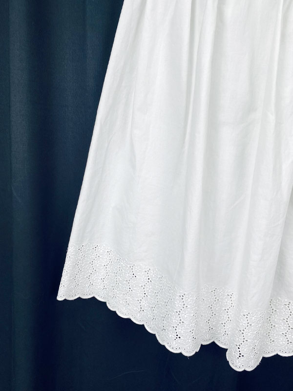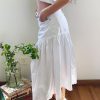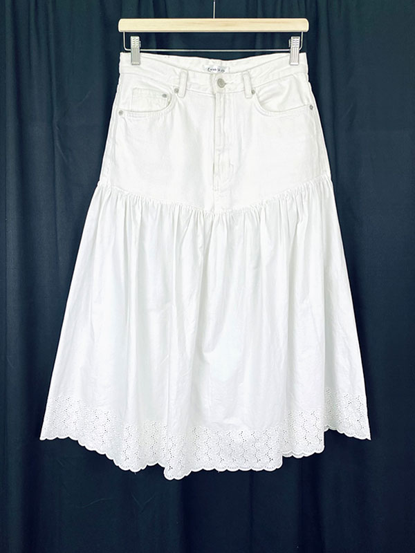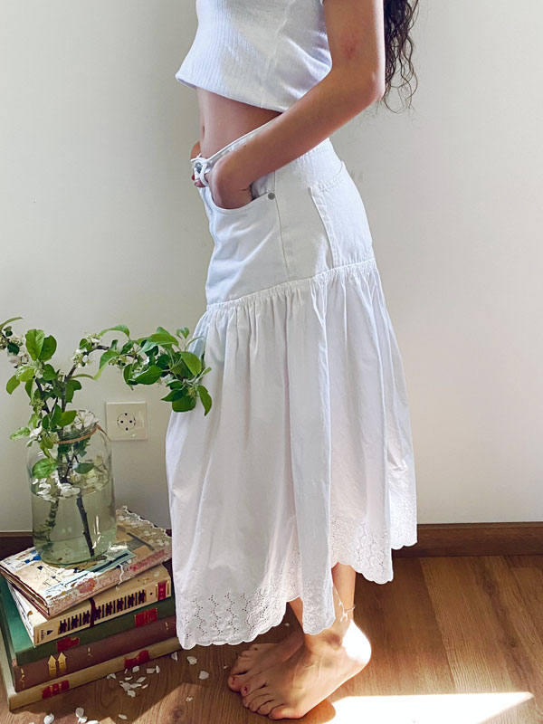 Falda upcycling, parte superior jeans color blanco, recuperados de la industria «fast fashion» parte baja procedente de una antigua sábana de lino color blanco.
